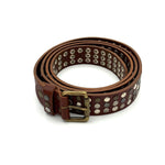 Cintura realizzata in vera pelle color marrone, impreziosita da file di borchie metalliche che ne esaltano lo stile deciso e contemporaneo. Dotata di fibbia classica in metallo, può essere indossata in vita o sui fianchi per valorizzare il punto vita o aggiungere un tocco grintoso a qualsiasi outfit.