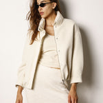 Giacca bomber imbottita dal design moderno e versatile, realizzata in misto lana con dettagli a contrasto che richiamano lo stile piumino. Presenta una chiusura frontale con zip e bottoni a pressione, che assicura praticità e protezione nelle giornate più fredde.