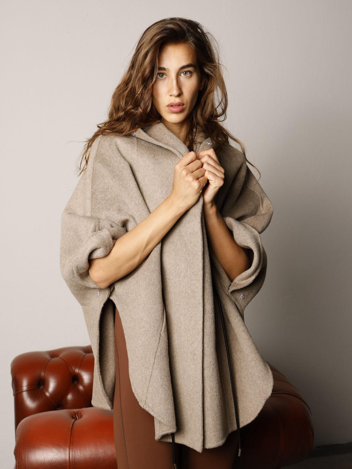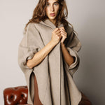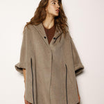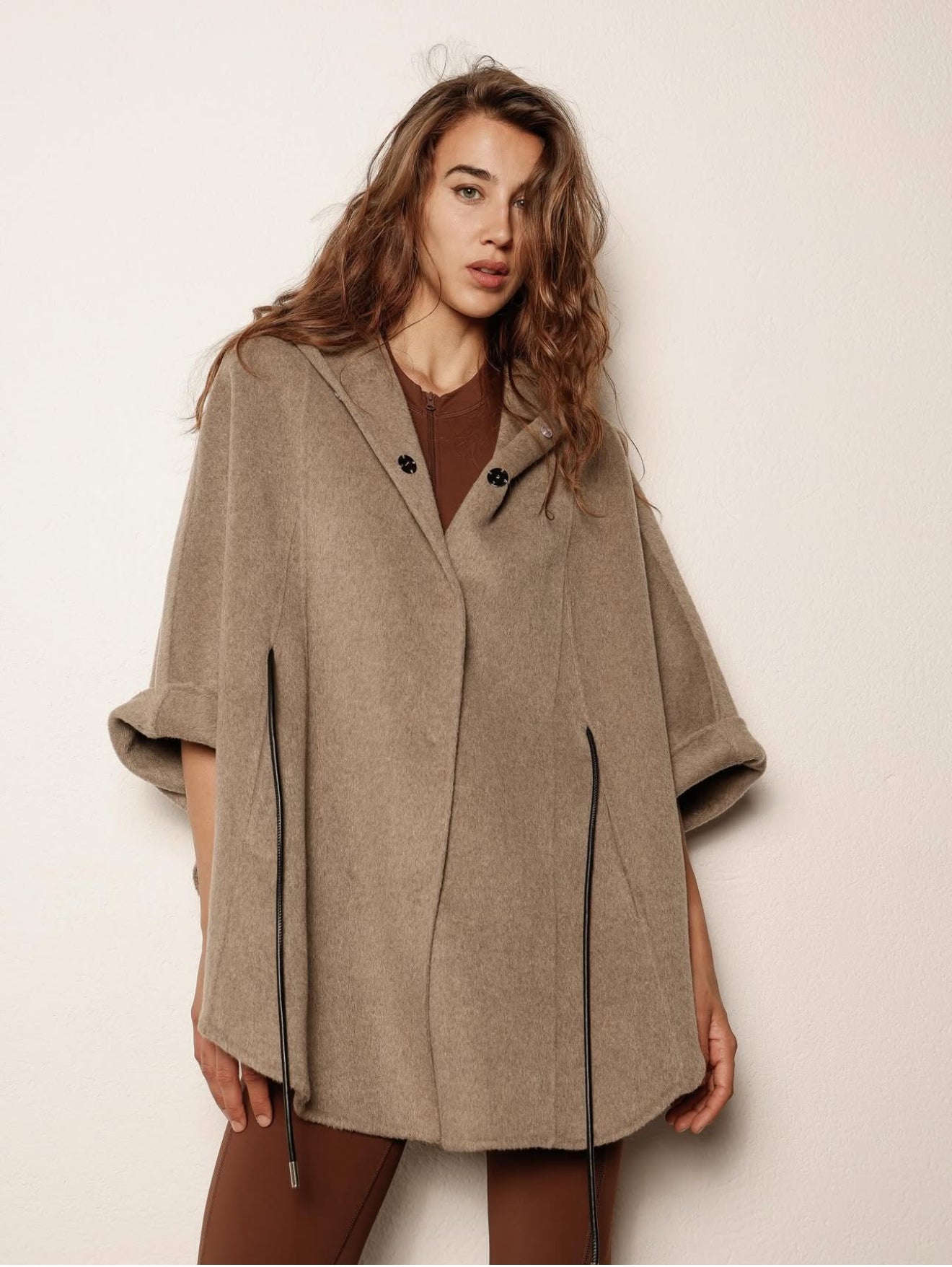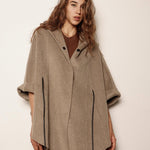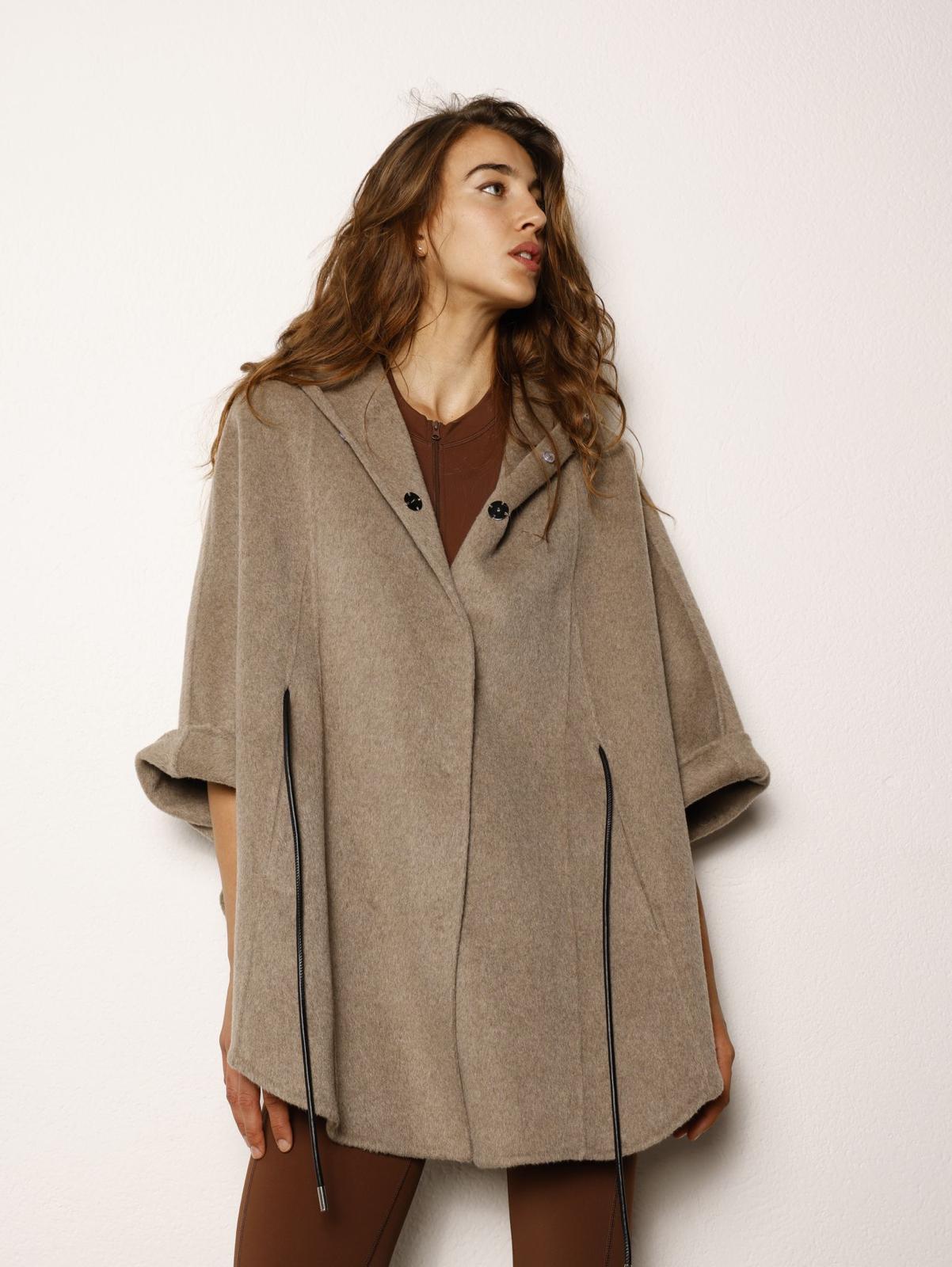 Cappotto dal taglio over ispirato allo stile mantella, realizzato in un caldo tessuto misto lana. Il modello presenta chiusura frontale con bottoni invisibili e spacchi laterali che ne valorizzano la linea morbida e fluida. Può essere indossato come mantella aperta o trasformato in cappotto con maniche, grazie ai bottoni presenti sui lati.