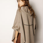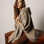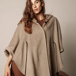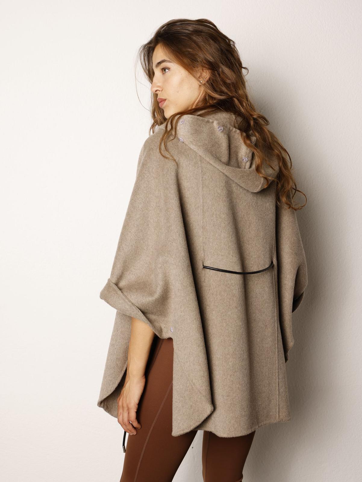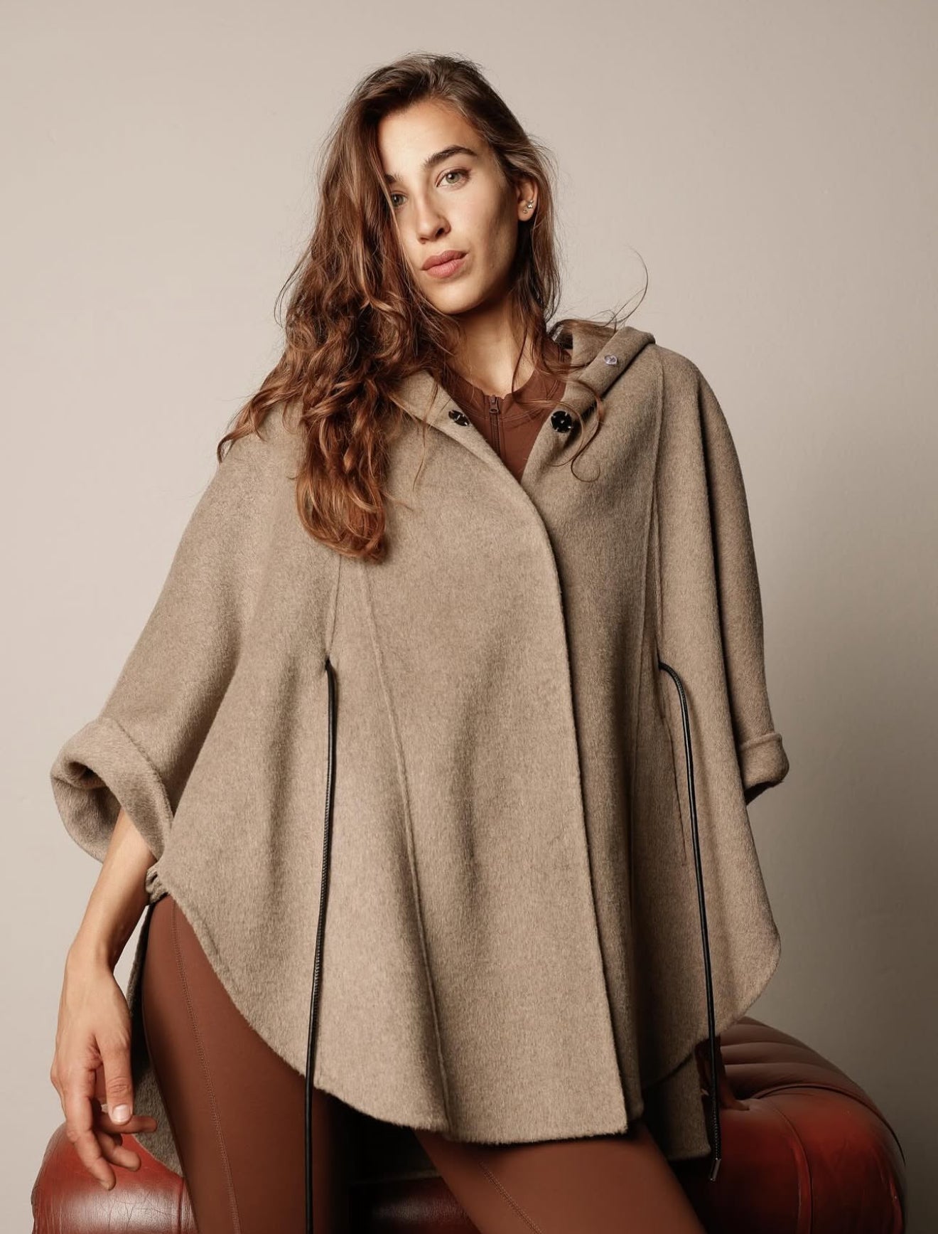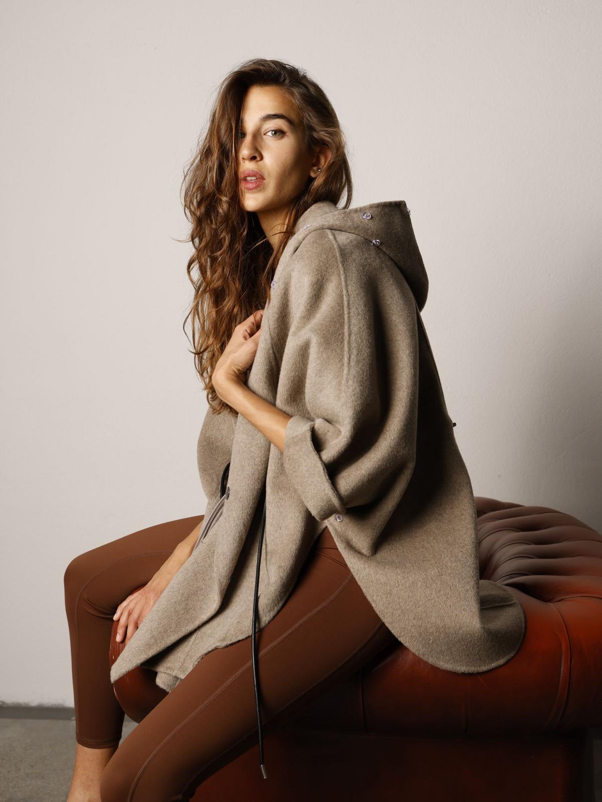Cappotto dal taglio over ispirato allo stile mantella, realizzato in un caldo tessuto misto lana. Il modello presenta chiusura frontale con bottoni invisibili e spacchi laterali che ne valorizzano la linea morbida e fluida. Può essere indossato come mantella aperta o trasformato in cappotto con maniche, grazie ai bottoni presenti sui lati.