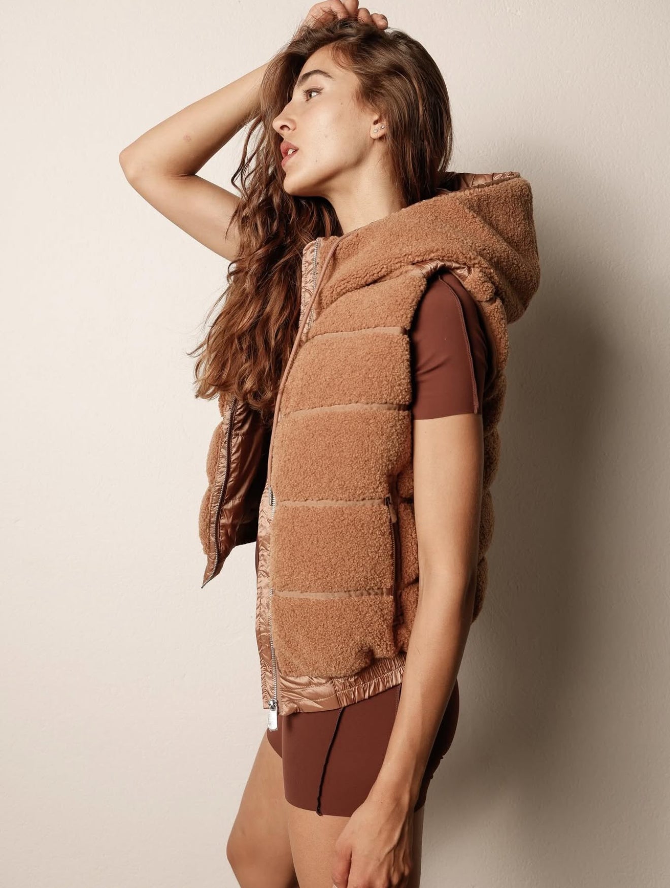 Smanicato in eco-pelliccia dal design moderno e funzionale, caratterizzato da una texture soffice e calda che dona comfort e stile. La chiusura frontale con zip e le pratiche tasche laterali rendono il capo versatile e perfetto per la stagione fredda.