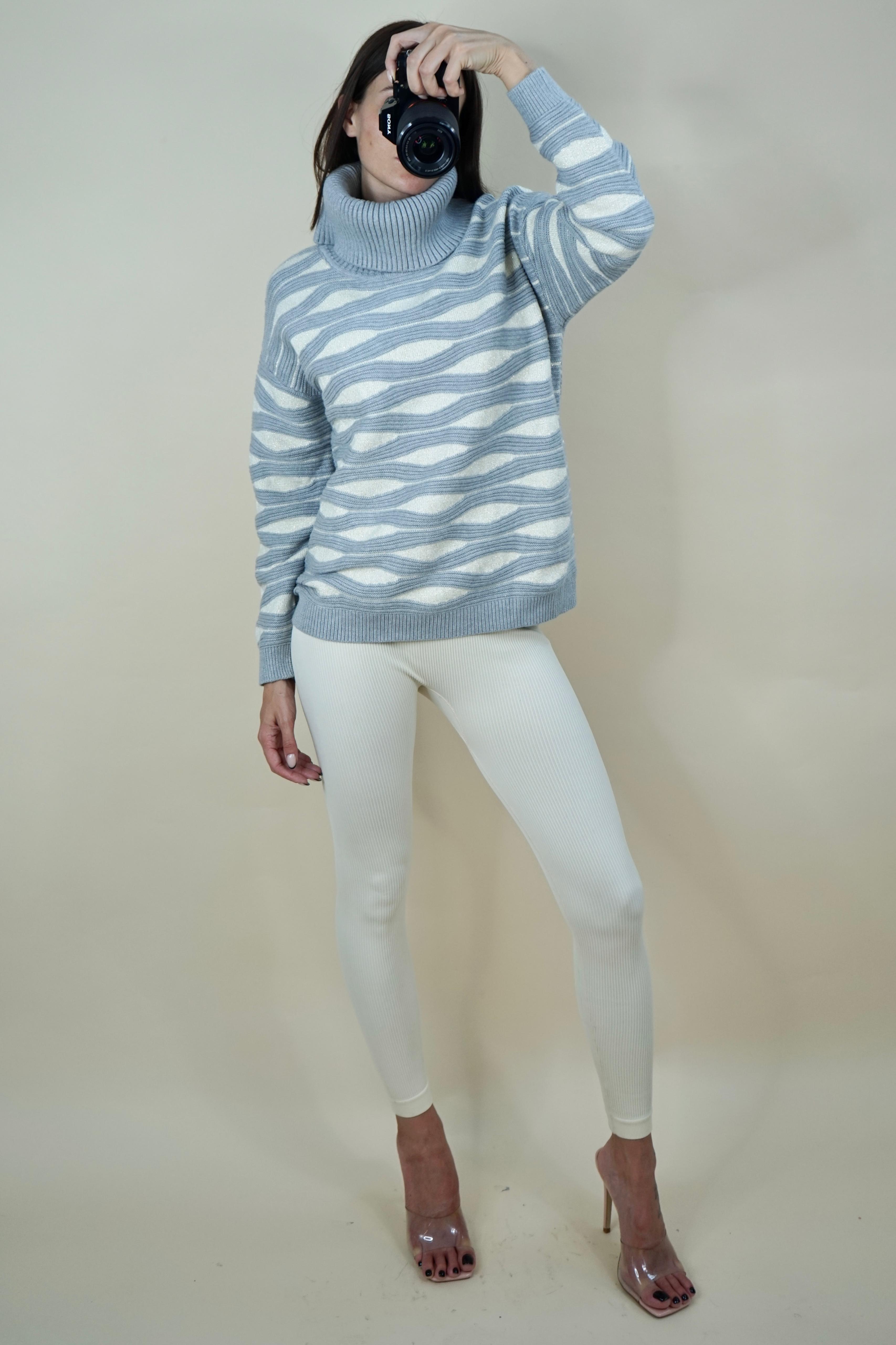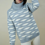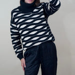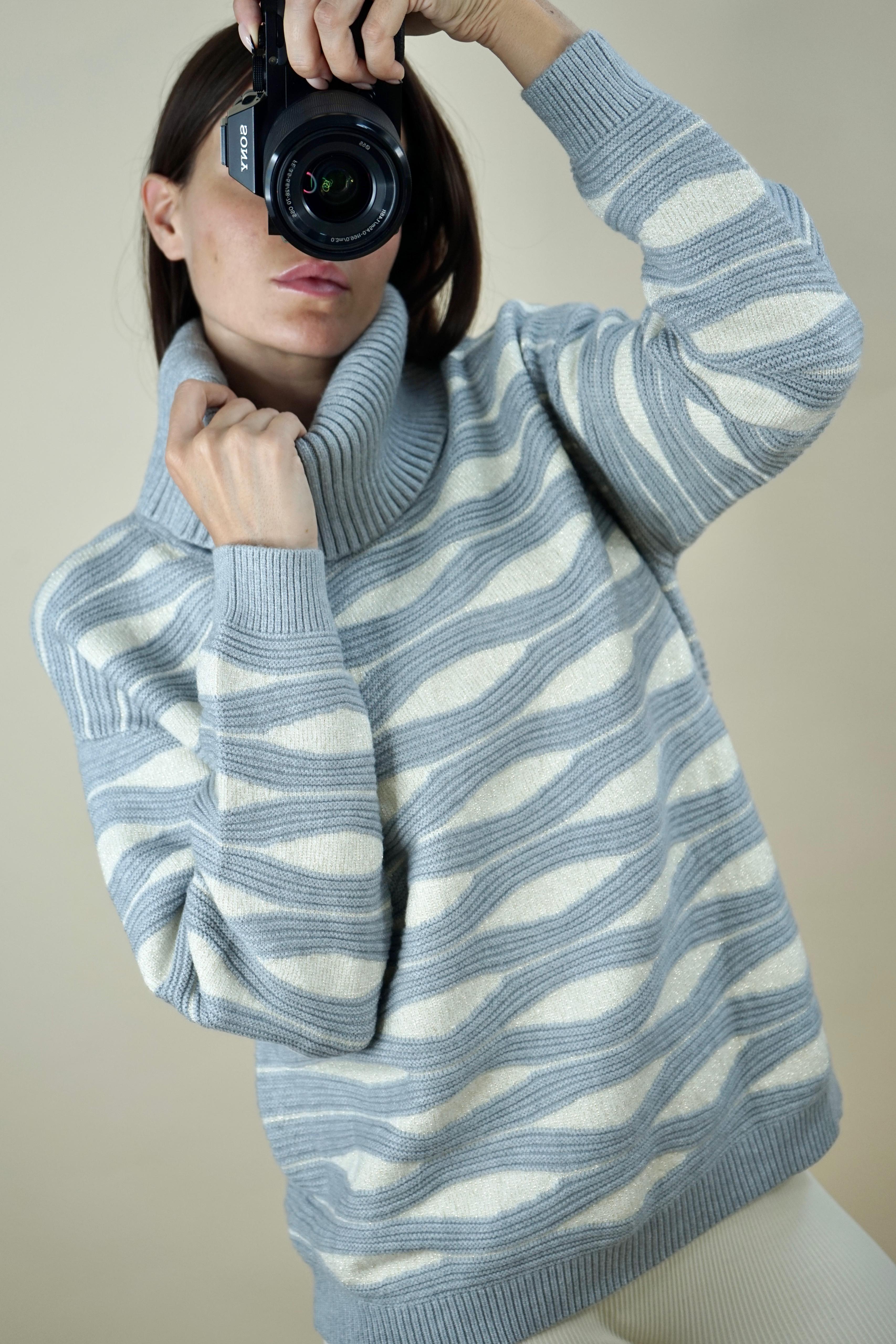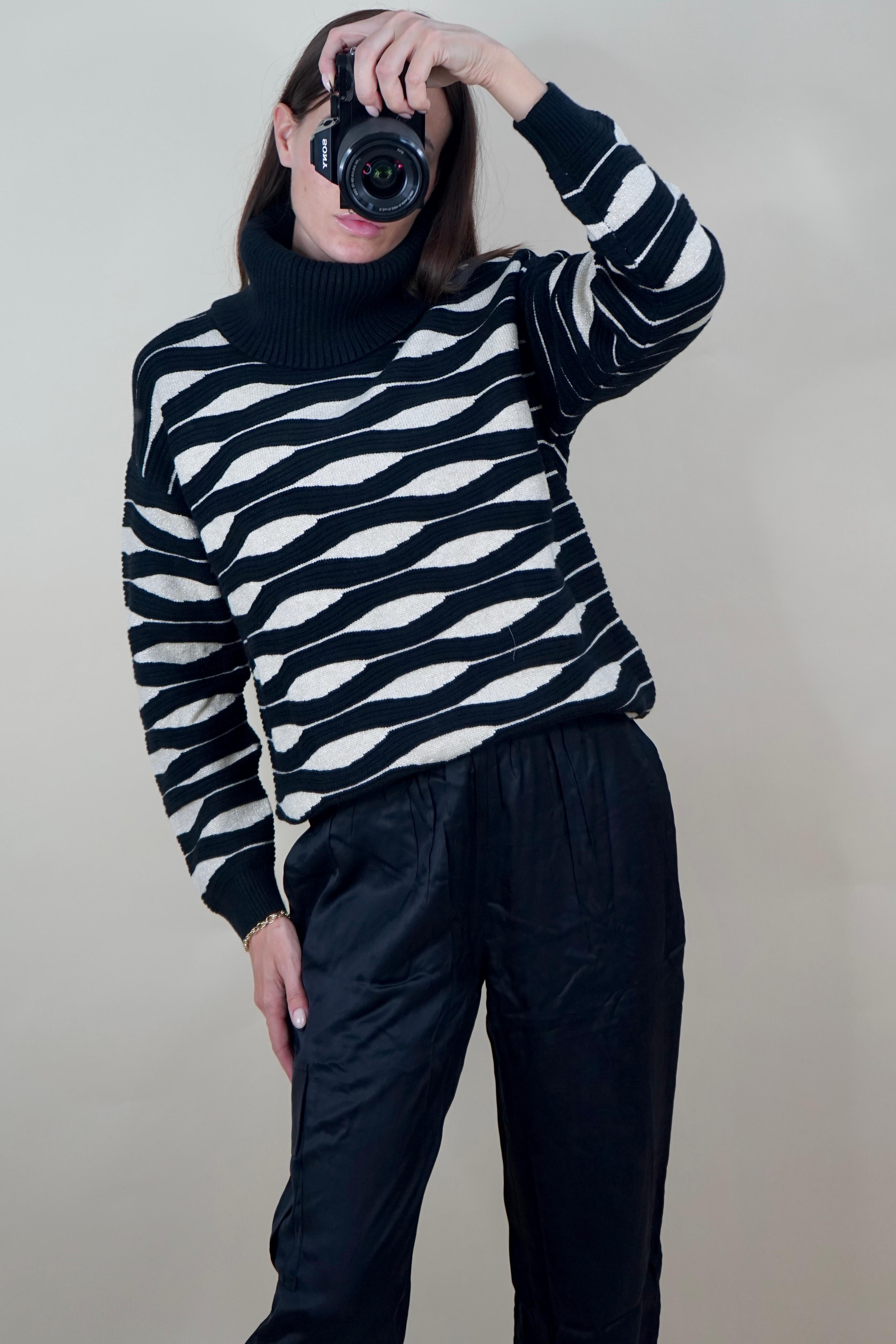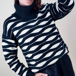 Maglione dolcevita realizzato in maglia morbida e confortevole, caratterizzato da un design moderno con righe ondulate a contrasto. Il collo alto a coste garantisce calore e stile, mentre le maniche lunghe con polsino elasticizzato e l’orlo finale con elastico assicurano una vestibilità pratica e piacevole. Un capo versatile, perfetto per look casual e contemporanei.
