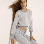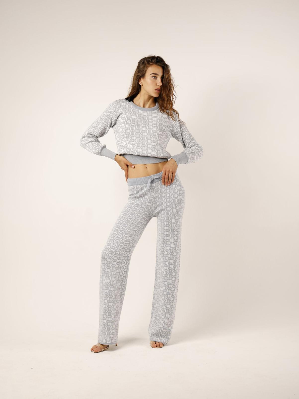 La vita è dotata di elastico regolabile con coulisse, per garantire praticità e una vestibilità personalizzabile. La fantasia geometrica nei toni del grigio chiaro e bianco arricchisce il capo con un tocco moderno e sofisticato, facilmente abbinabile a maglie e pullover coordinati.
