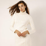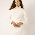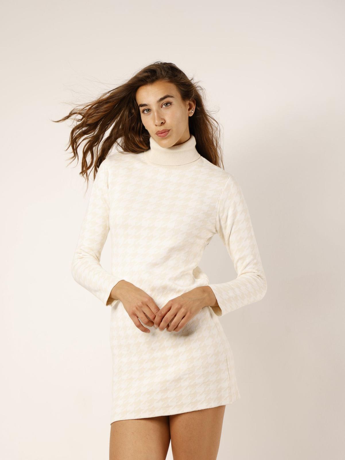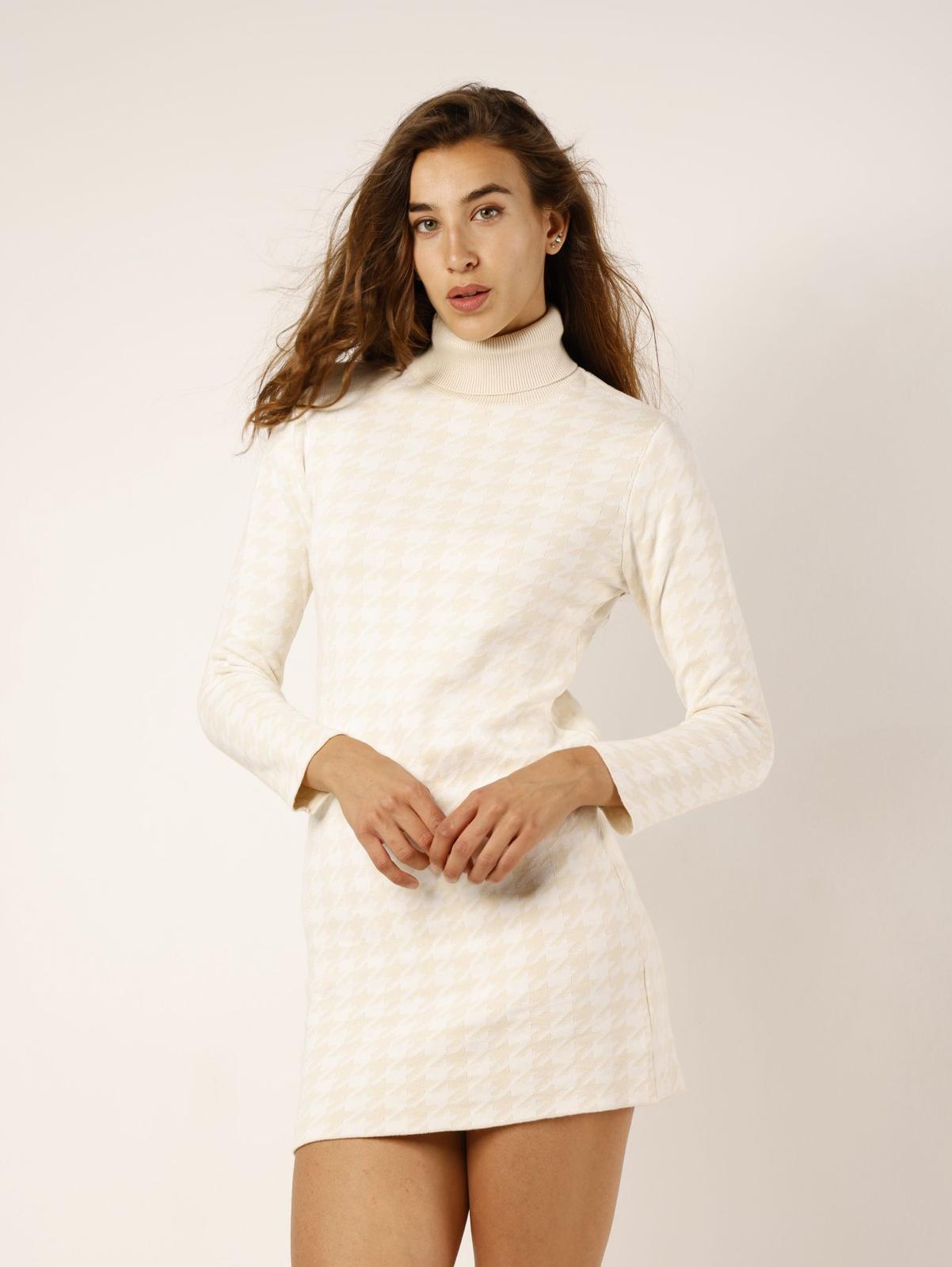Abito corto dal design moderno e raffinato, realizzato in morbido cotone. Il modello presenta un elegante collo dolcevita e maniche lunghe, con una silhouette dritta e aderente che valorizza la figura.