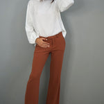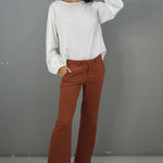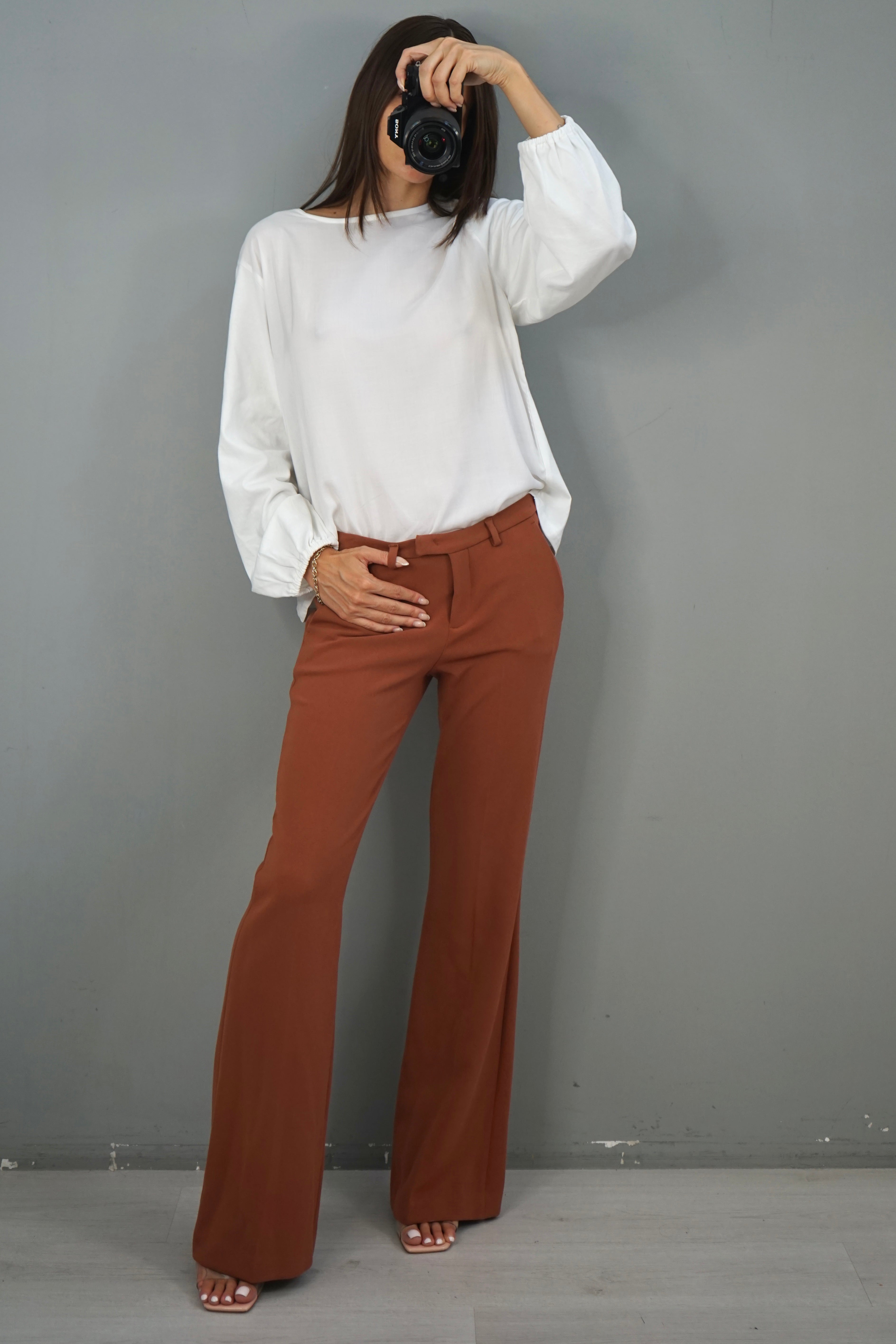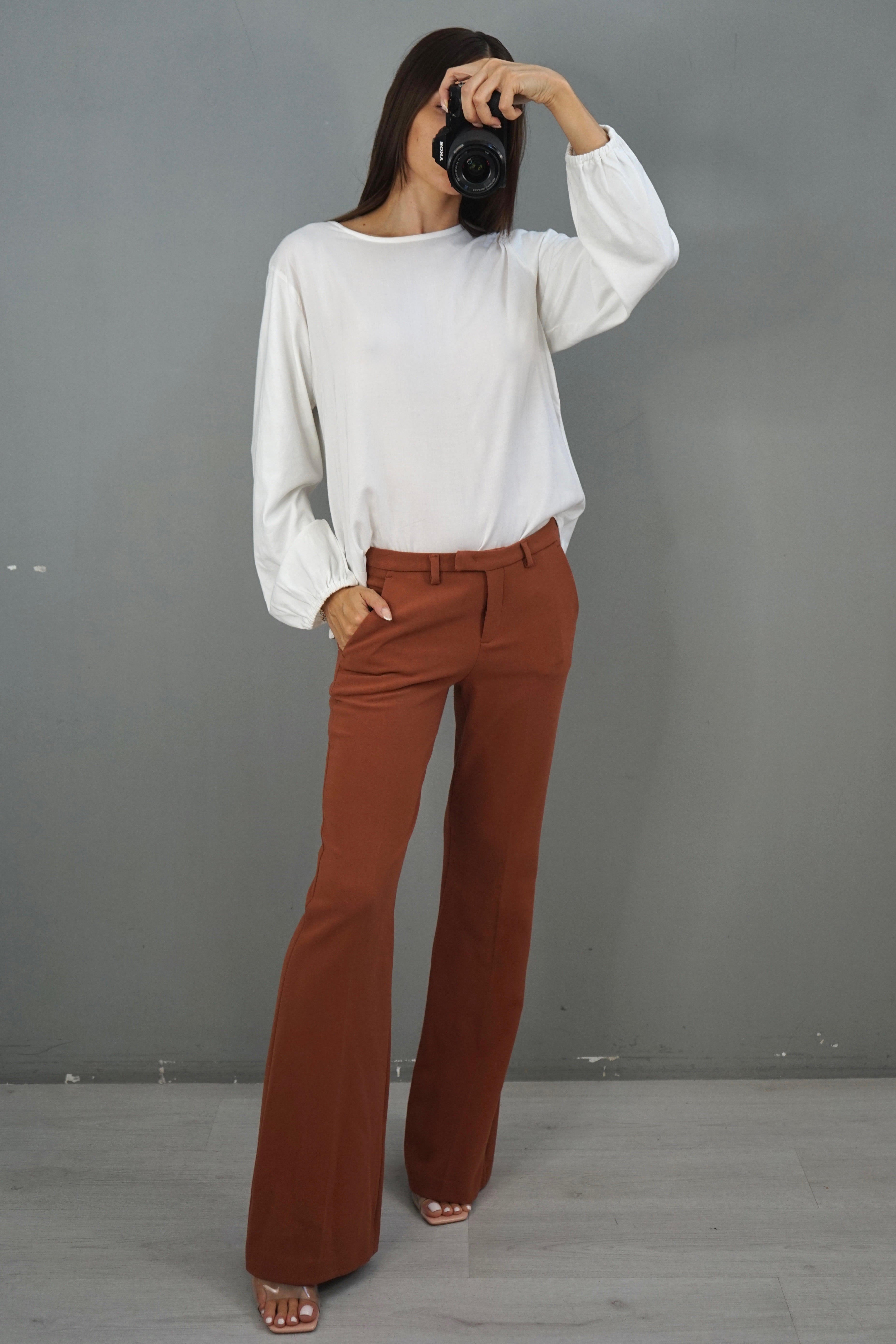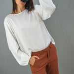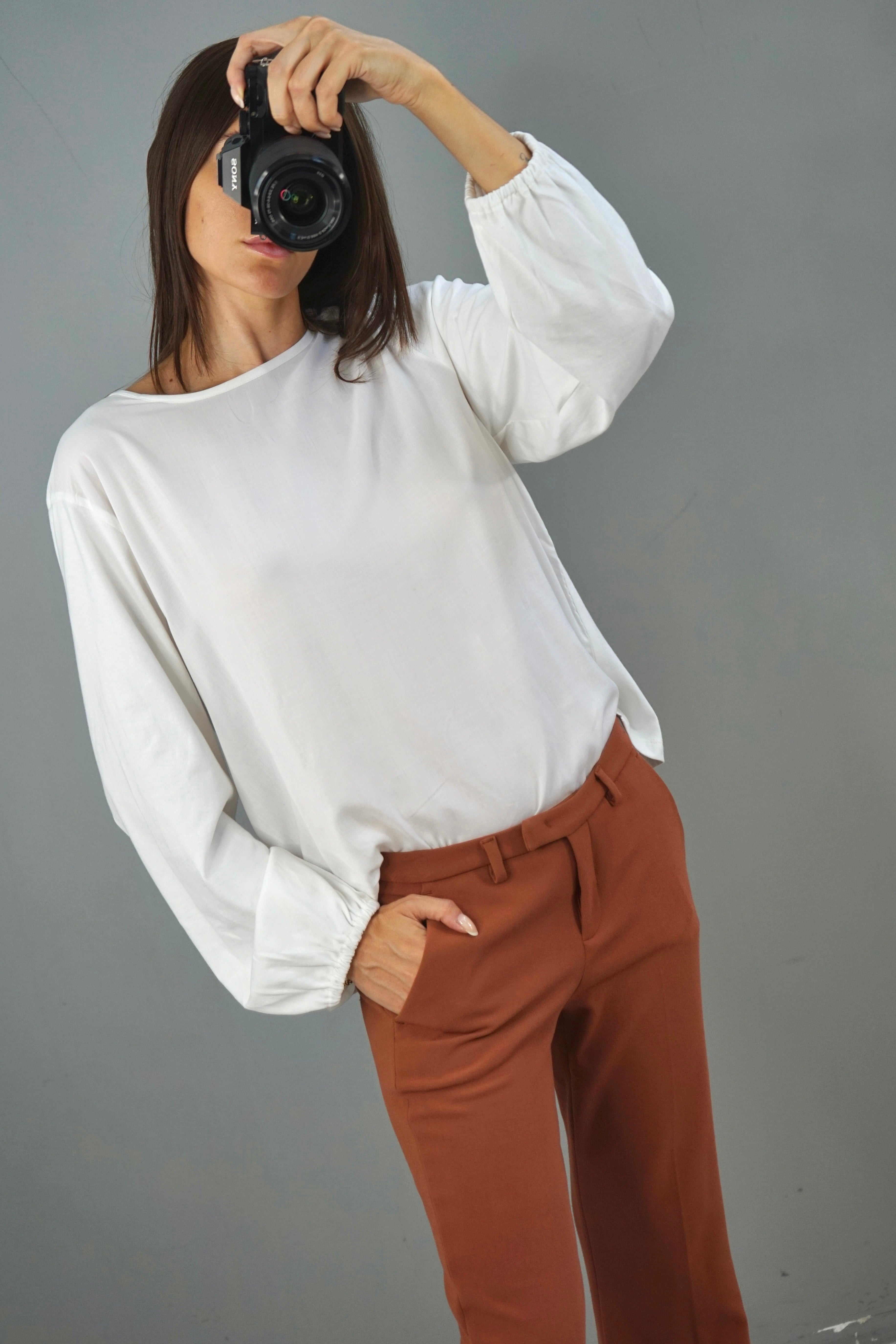 Il modello presenta un elegante scollo rotondo e maniche lunghe a palloncino con polsini arricciati, che donano volume e movimento al capo. Un bottone sul retro del collo ne facilita l’indosso. Può essere indossata sia in look casual con denim, sia in abbinamenti più eleganti con gonne o pantaloni sartoriali.