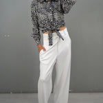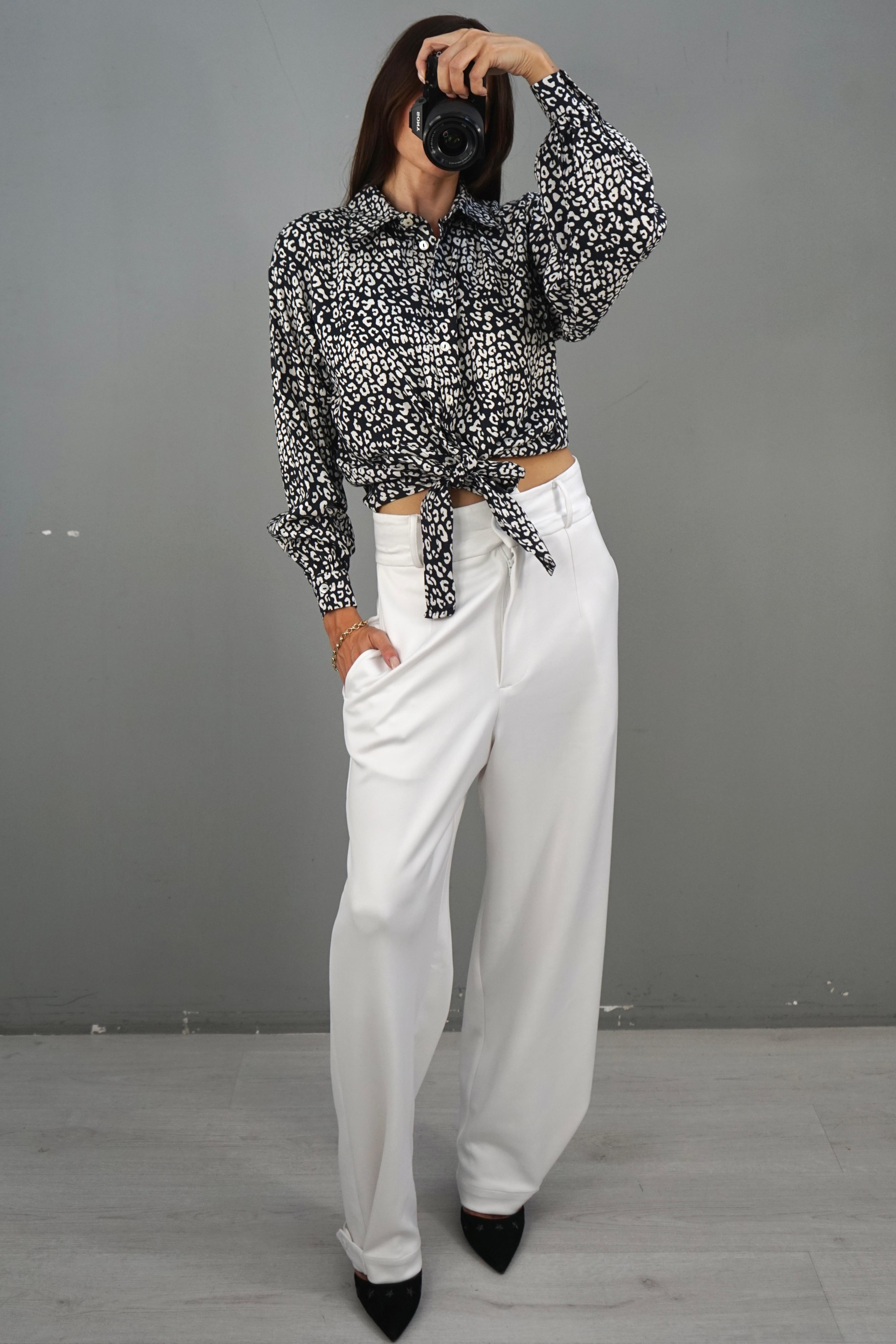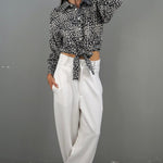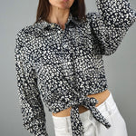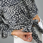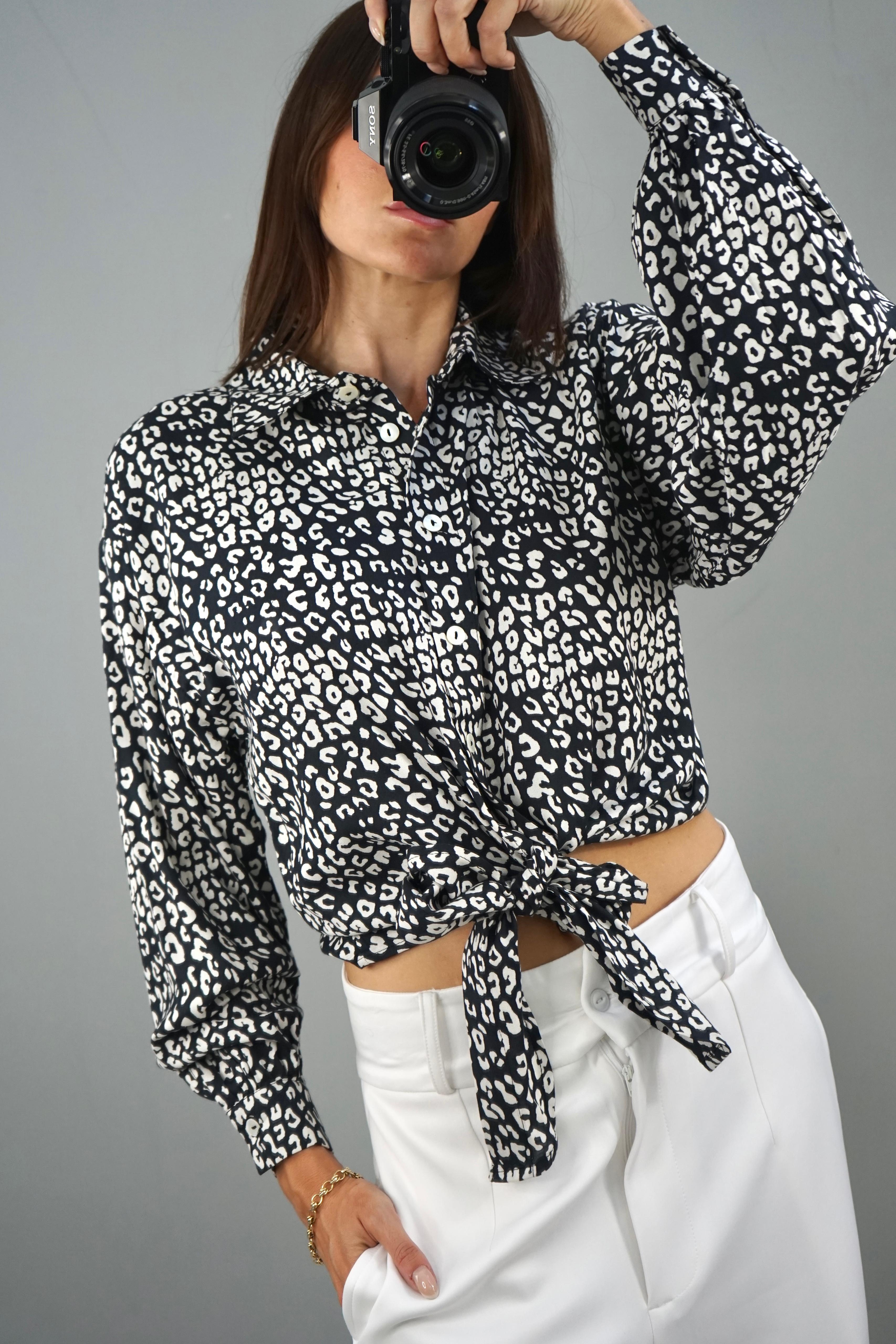 Blusa a maniche lunghe con stampa a macchie, il modello presenta un colletto classico, chiusura frontale con bottoni in perla e due strisce in tessuto da annodare sul davanti, creando un effetto cropped. Le maniche ampie, leggermente a palloncino, terminano con polsini chiusi da bottone.