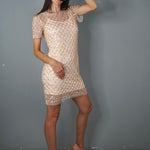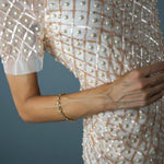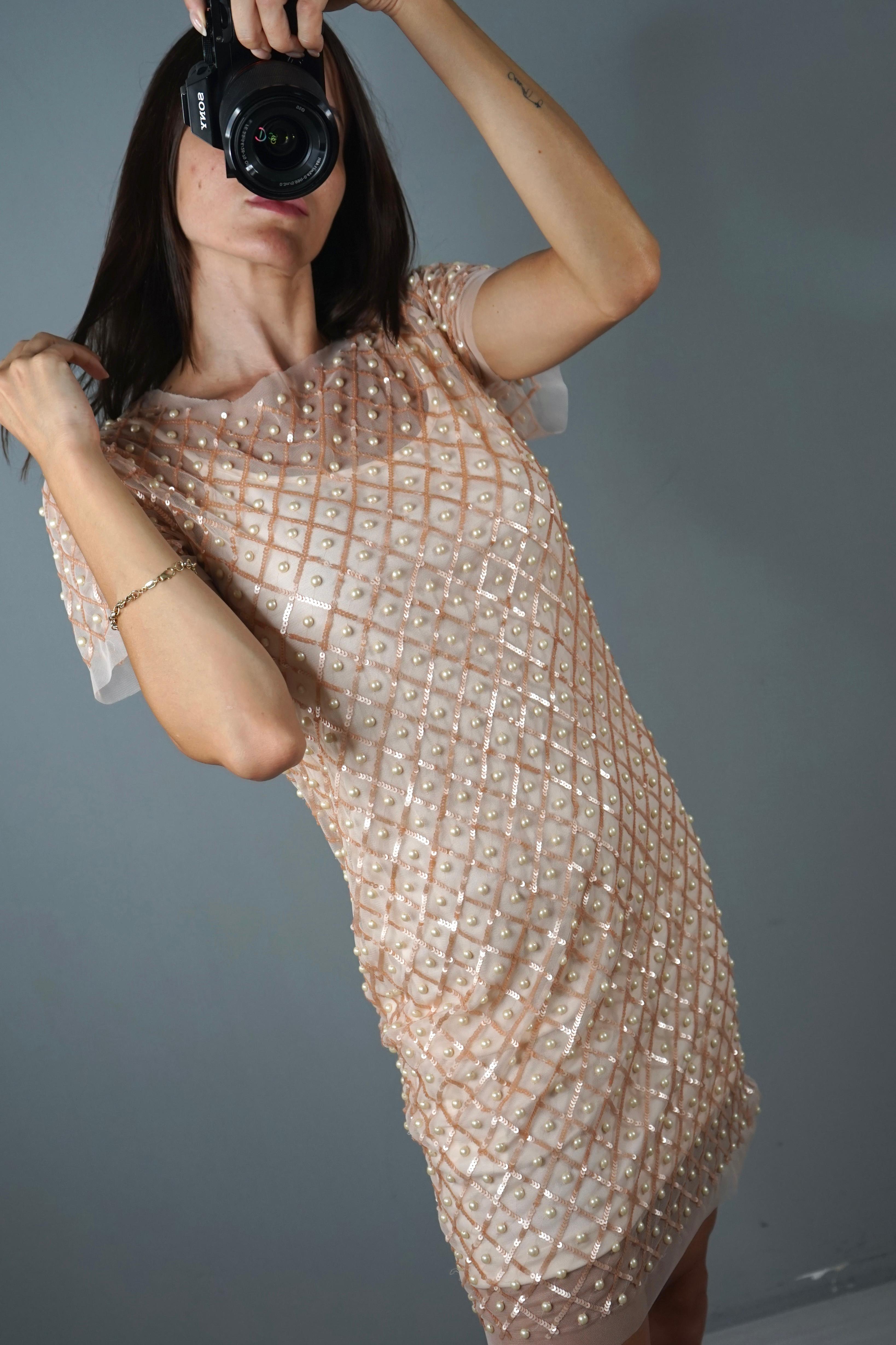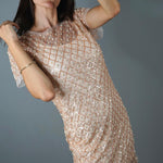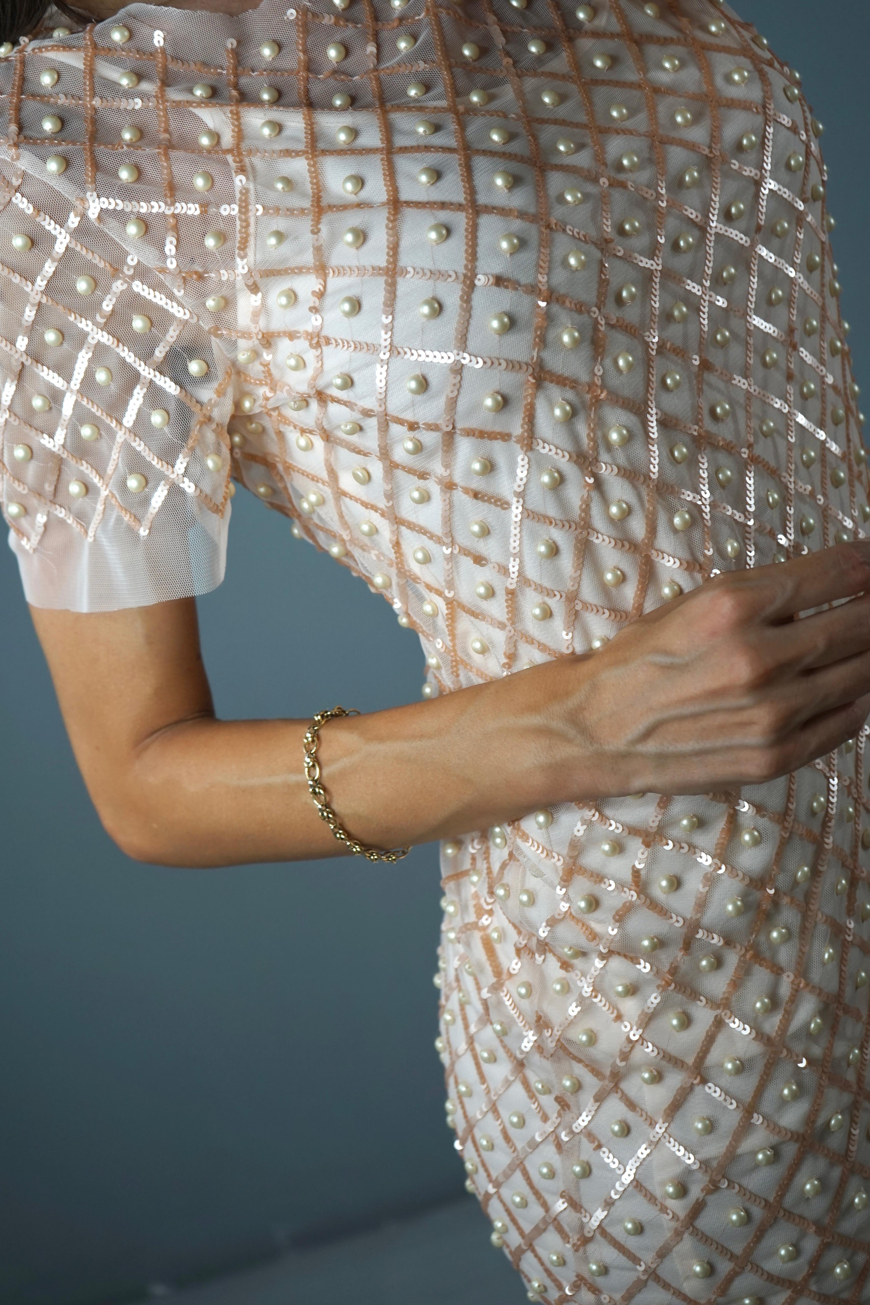 Mini abito a maniche corte con silhouette aderente e femminile, impreziosito da un motivo geometrico formato da paillettes e perline effetto perla. Il vestito presenta uno strato esterno in tulle trasparente ricamato, che crea un raffinato gioco di luci e texture, donando al look un'eleganza delicata.