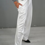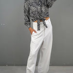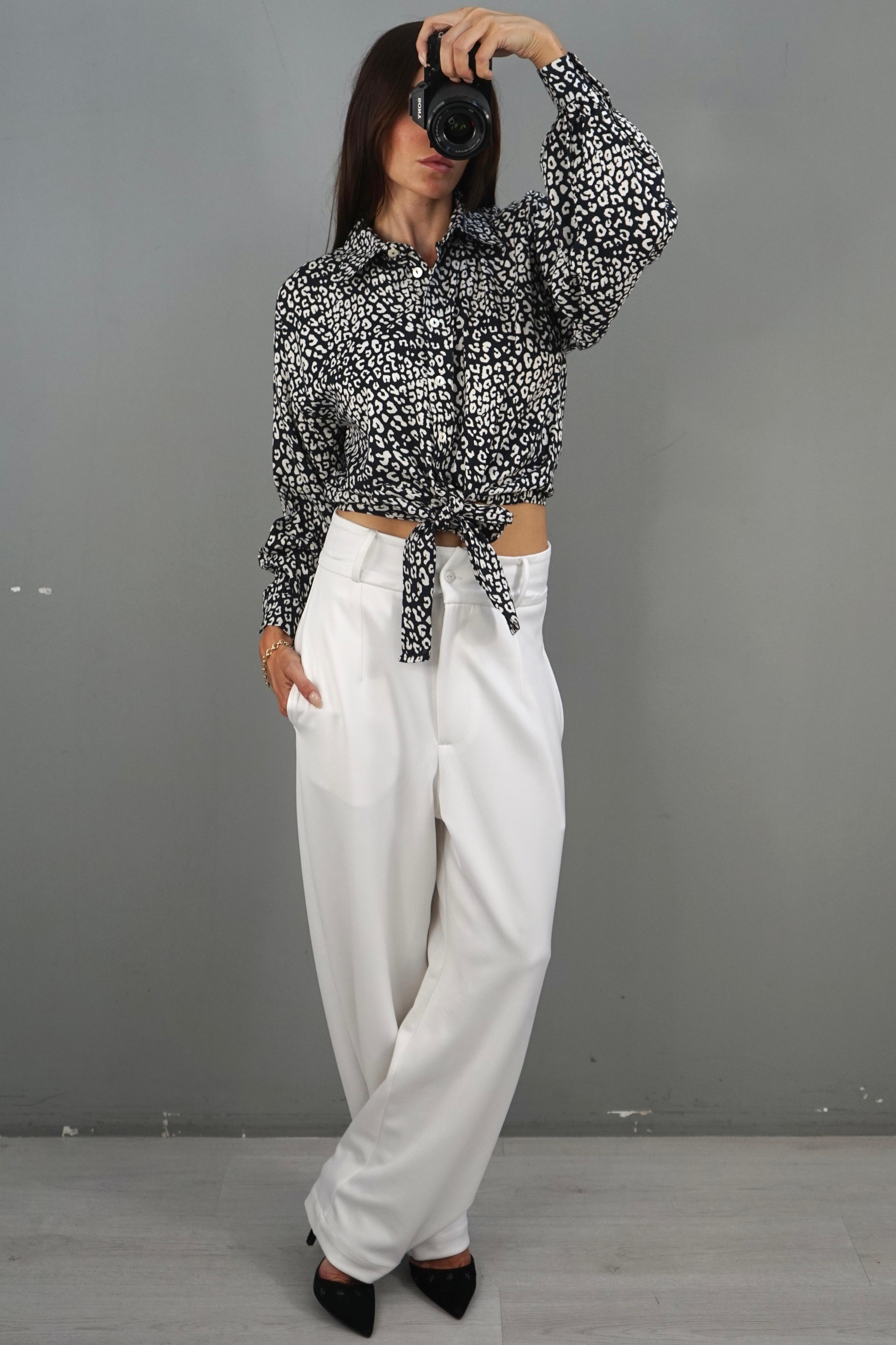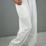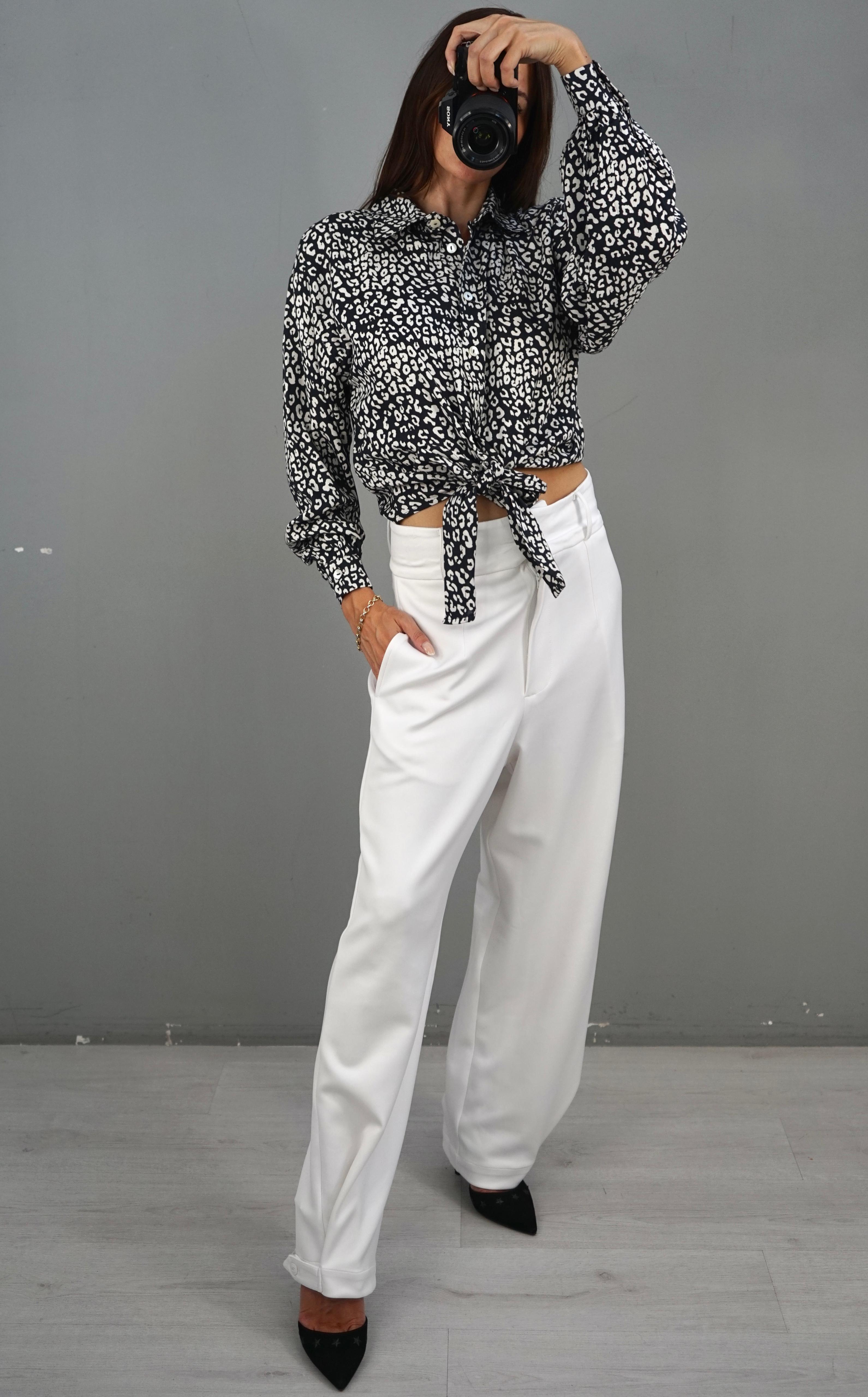 Pantaloni a vita alta con gamba ampia e fluida, pensati per slanciare la silhouette con eleganza. Il modello è completato da pratiche tasche frontali e da un orlo rifinito con bottone, un dettaglio che aggiunge versatilità al capo. Ideali da abbinare sia a camicie eleganti che a top più moderni.