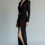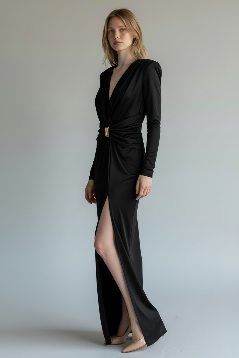 Abito lungo elegante, realizzato in tessuto fluido ed elasticizzato e Made in Italy. Il design è studiato per valorizzare la silhouette grazie a un raffinato gioco di drappeggi che, sul busto, confluiscono in una cintura, modellata direttamente dal tessuto dell’abito e fissata da un dettaglio metallico rettangolare che aggiunge un accento luminoso e sofisticato.