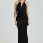 Il modello presenta un profondo scollo a V con nodo centrale sul busto, dettaglio che valorizza il décolleté e dona carattere al capo. Il collo all’americana è impreziosito da un accento metallico dorato, che aggiunge un tocco luminoso e raffinato. La schiena, lasciata scoperta dal taglio halter, enfatizza ulteriormente l’eleganza dell’abito.