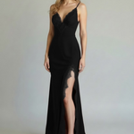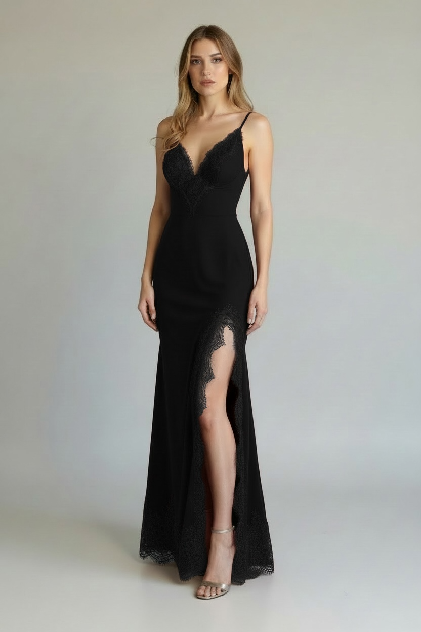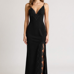 Lo scollo profondo a V e le spalline sottili donano leggerezza al capo, mentre il pizzo applicato impreziosisce il décolleté e rifinisce lo spacco sul lato sinistro, aggiungendo un tocco sofisticato e seducente. Il taglio in sbieco garantisce una caduta morbida e naturale del tessuto, accompagnando i movimenti con eleganza.