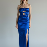 La vita è ben definita e accompagna una gonna lunga e aderente, completata da un audace spacco laterale che slancia la figura e aggiunge dinamismo al passo. La finitura satinata rende l’abito ideale per eventi serali, cerimonie e occasioni speciali.