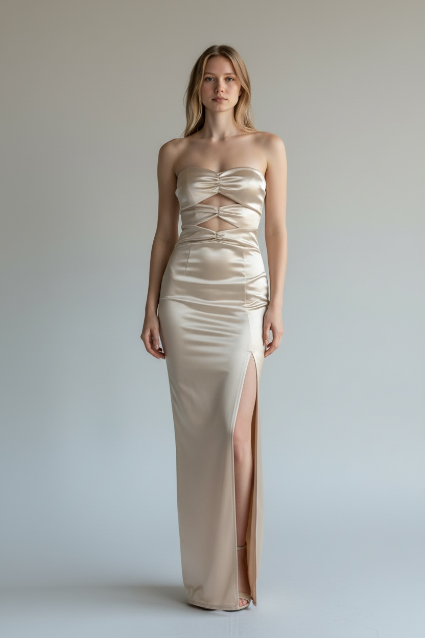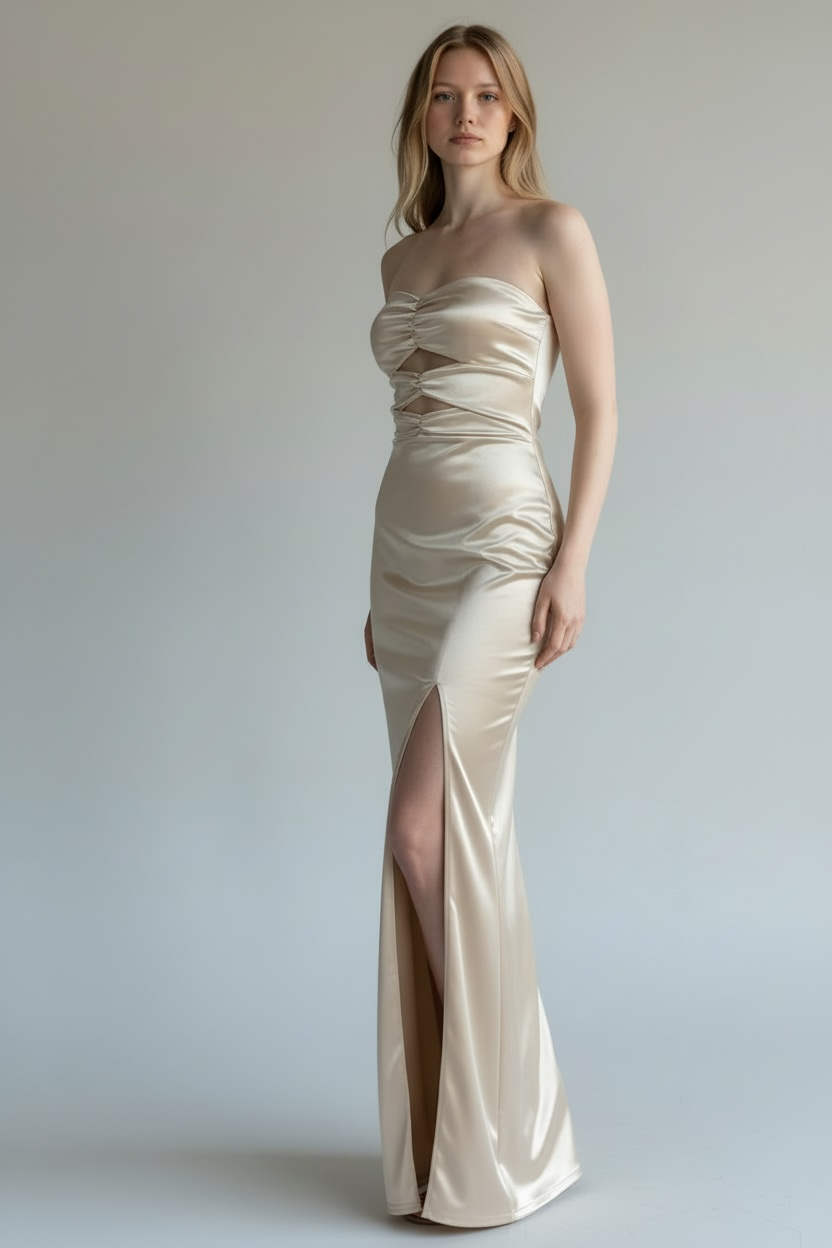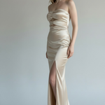 La vita è ben definita e accompagna una gonna lunga e aderente, completata da un audace spacco laterale che slancia la figura e aggiunge dinamismo al passo. La finitura satinata, nelle tonalità champagne/oro chiaro, rende l’abito ideale per eventi serali, cerimonie e occasioni speciali.