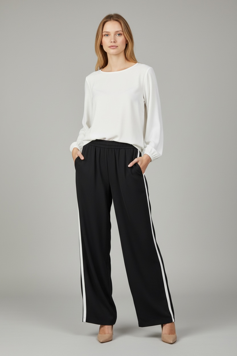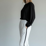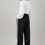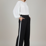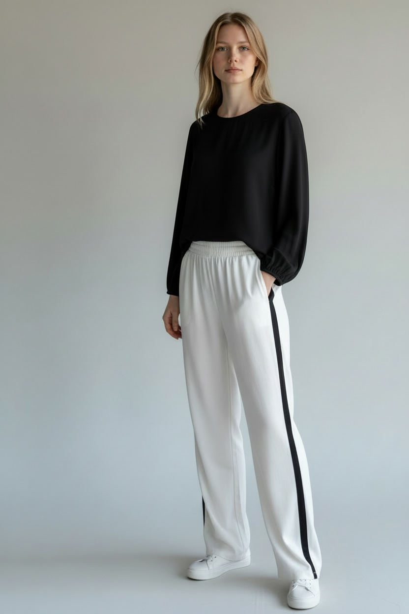 Il modello presenta un elegante scollo rotondo e maniche lunghe a palloncino con polsini arricciati, che donano volume e movimento al capo. Un bottone sul retro del collo ne facilita l’indosso. Può essere indossata sia in look casual con denim, sia in abbinamenti più eleganti con gonne o pantaloni sartoriali.
