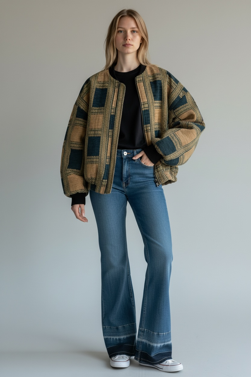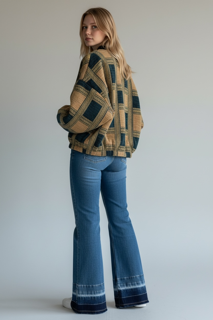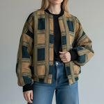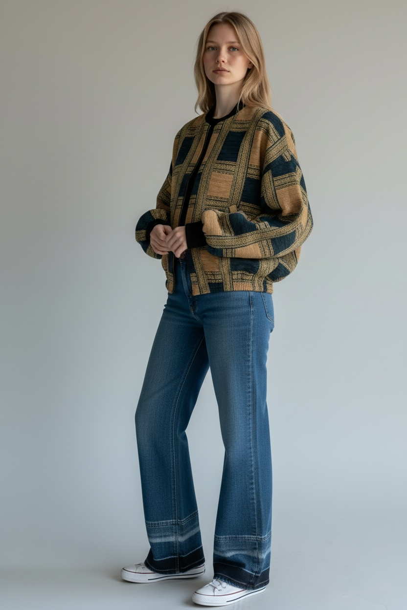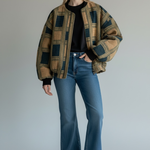 Bomber jacquard dal gusto rétro e sofisticato, realizzato in 100% cotone e prodotto Made in Italy. Il tessuto presenta una raffinata fantasia a quadri intrecciata, con una texture ricca e materica che valorizza il capo e ne sottolinea la qualità artigianale.
