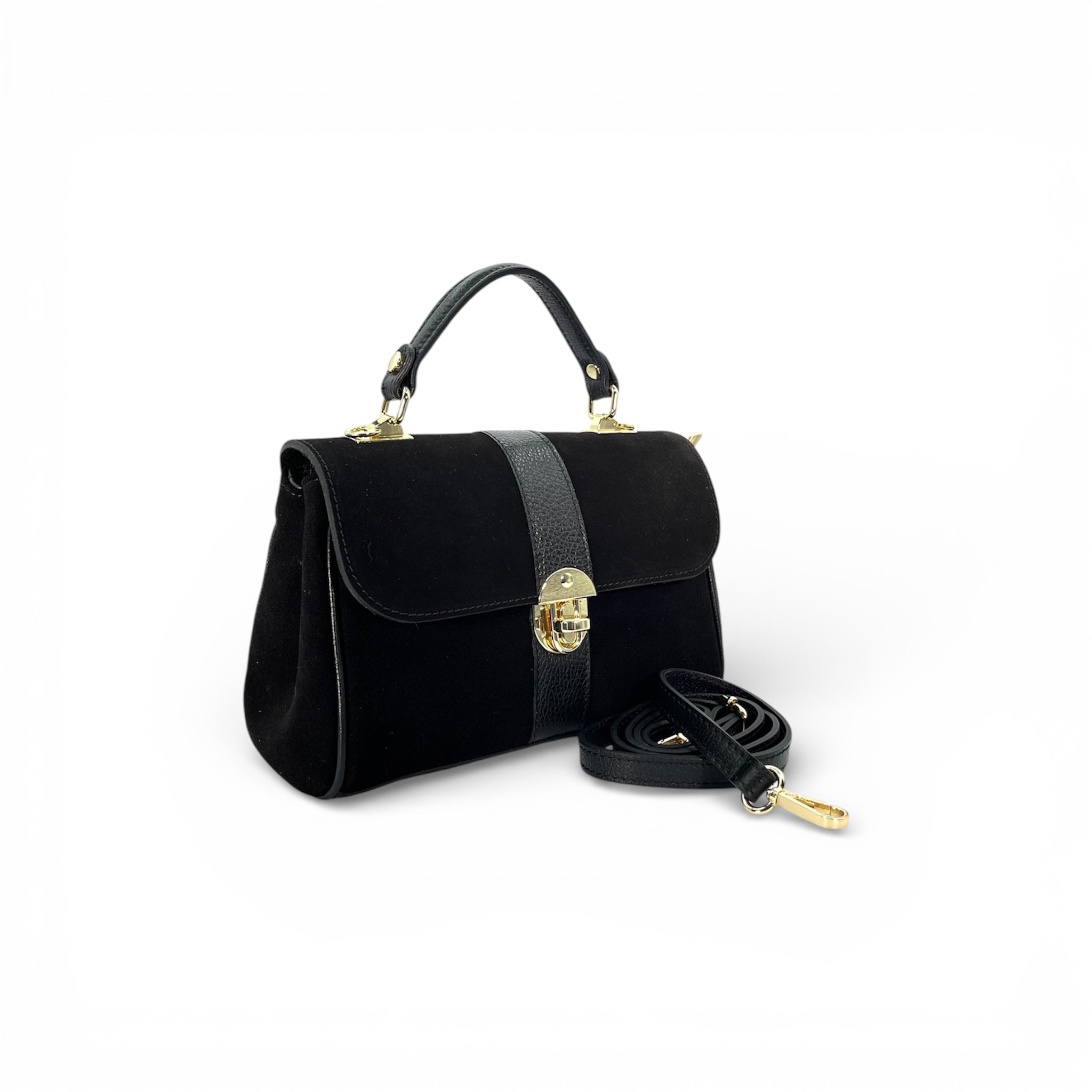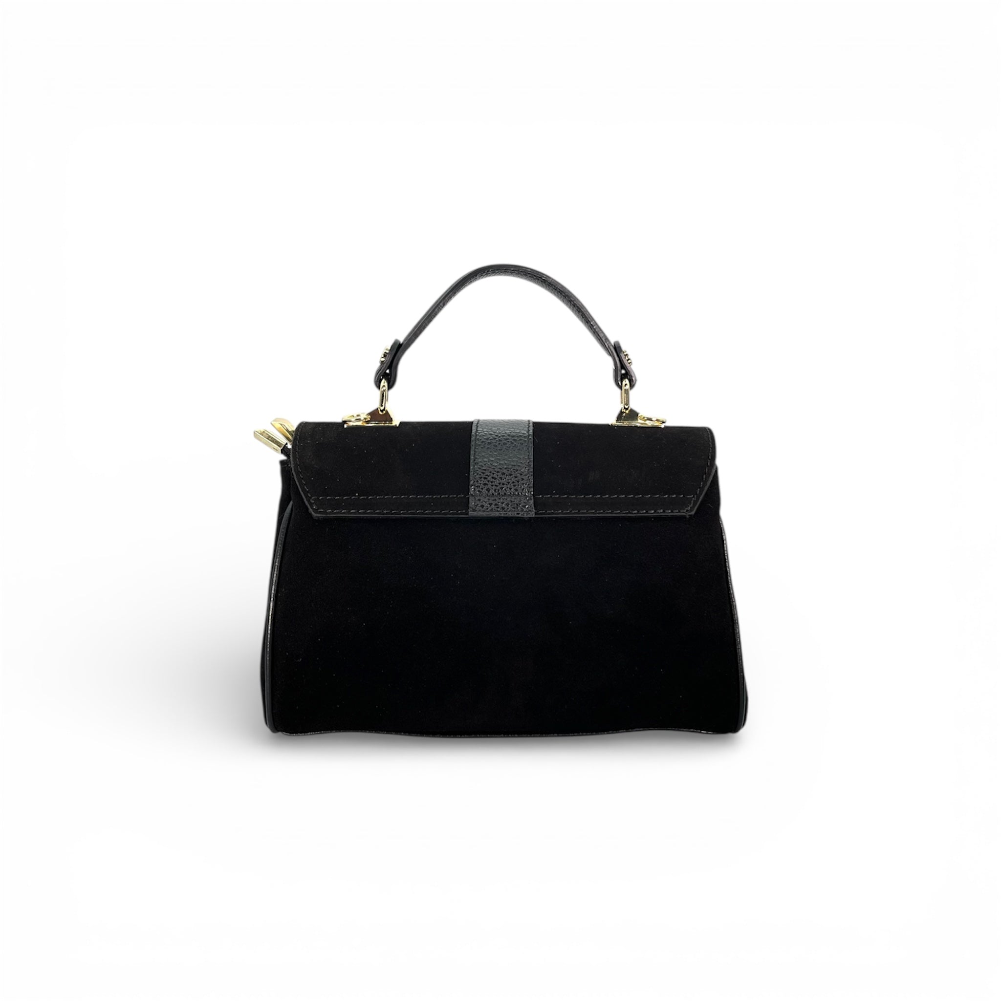 Borsa Satchel dal design strutturato e raffinato, realizzata in 100% pelle scamosciata e prodotta Made in Italy. Il corpo principale in camoscio morbido e vellutato è impreziosito da una fascia verticale in pelle liscia a contrasto sulla patta frontale, che dona carattere ed eleganza al modello.