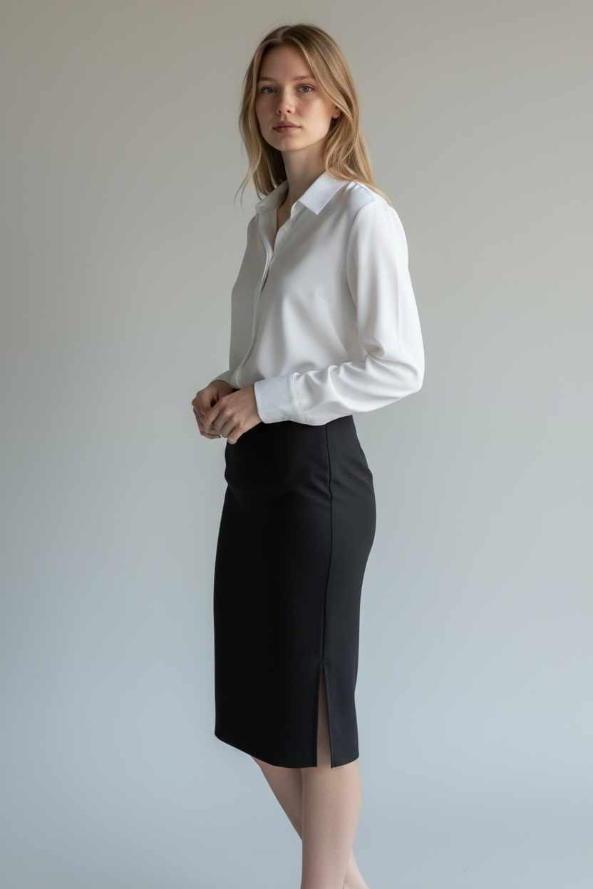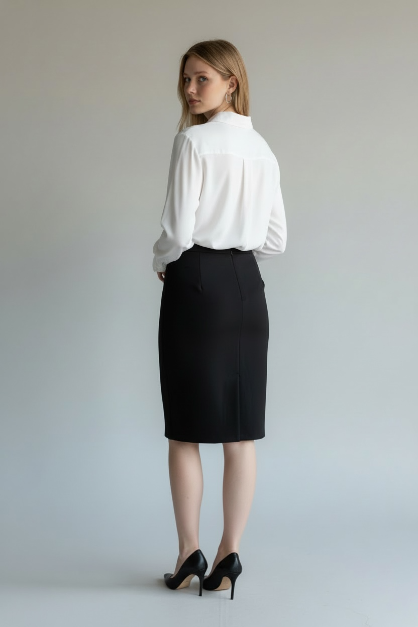 La vestibilità aderente a tubino segue le forme con comfort, mentre il discreto spacco laterale aggiunge praticità nei movimenti e un tocco di sensualità misurata. La lunghezza al ginocchio e il colore nero la rendono un capo estremamente versatile, ideale per contesti business, professionali o per look classici da ufficio.