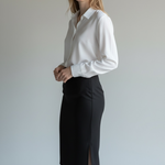 Gonna a matita dal design essenziale ed elegante, realizzata in 95% poliestere e 5% spandex. Il taglio a vita alta valorizza la silhouette, definendo il punto vita e slanciando la figura con una linea pulita e femminile.