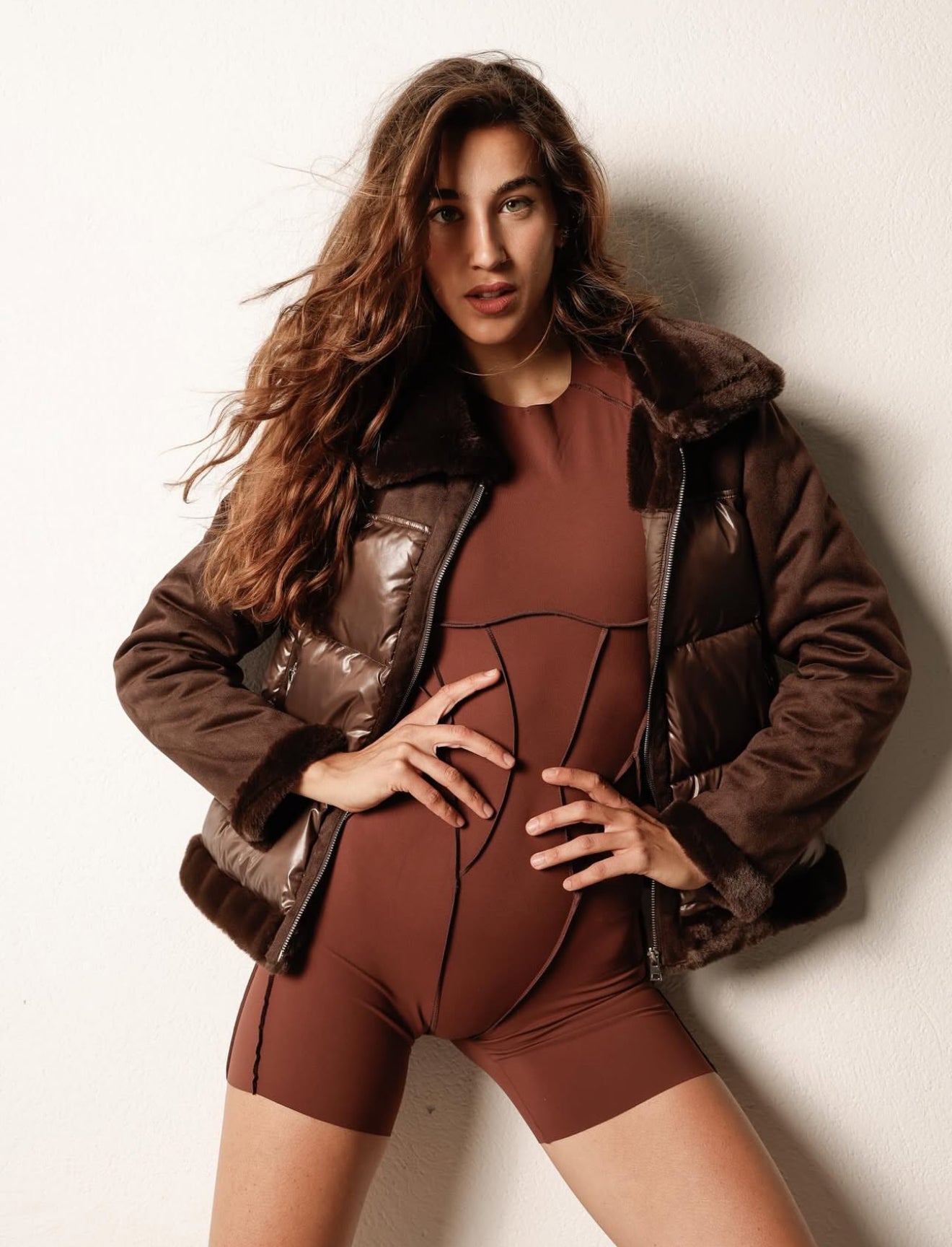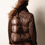 Giacca bomber corta dal design contemporaneo che combina texture diverse per un look deciso e versatile. Realizzata in montone sintetico, presenta pannelli effetto piumino sul busto, sia frontale che posteriore, che aggiungono volume e carattere al capo.