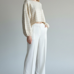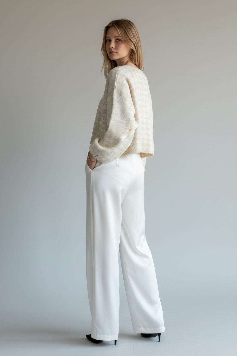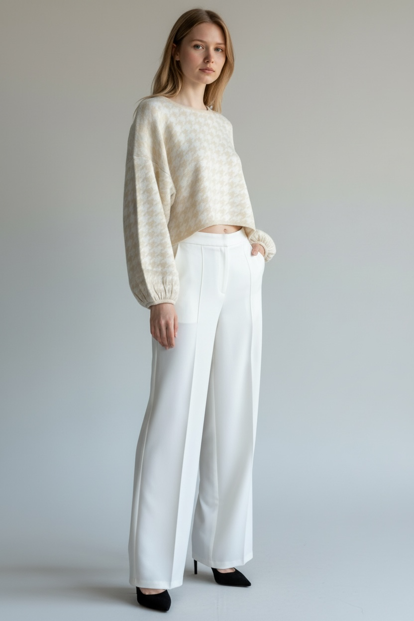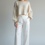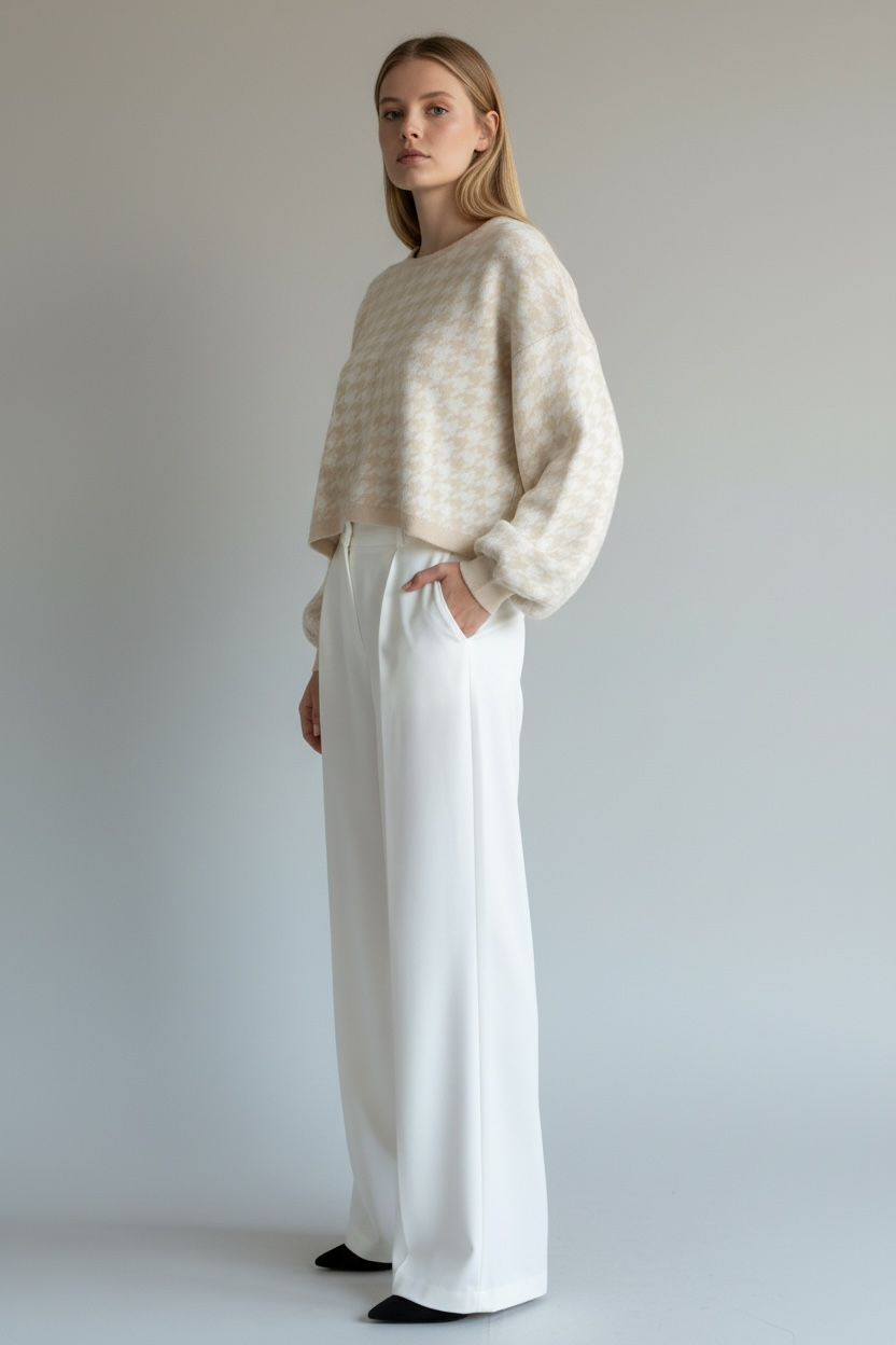 Maglione Cropped Sweater dal carattere casual-chic, realizzato in 100% cotone. Il motivo jacquard pied de poule nei toni crema e beige dona al capo un’eleganza senza tempo, reinterpretata in chiave moderna grazie al taglio cropped.